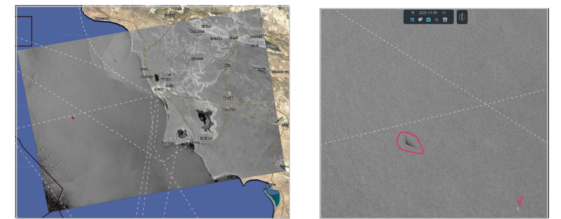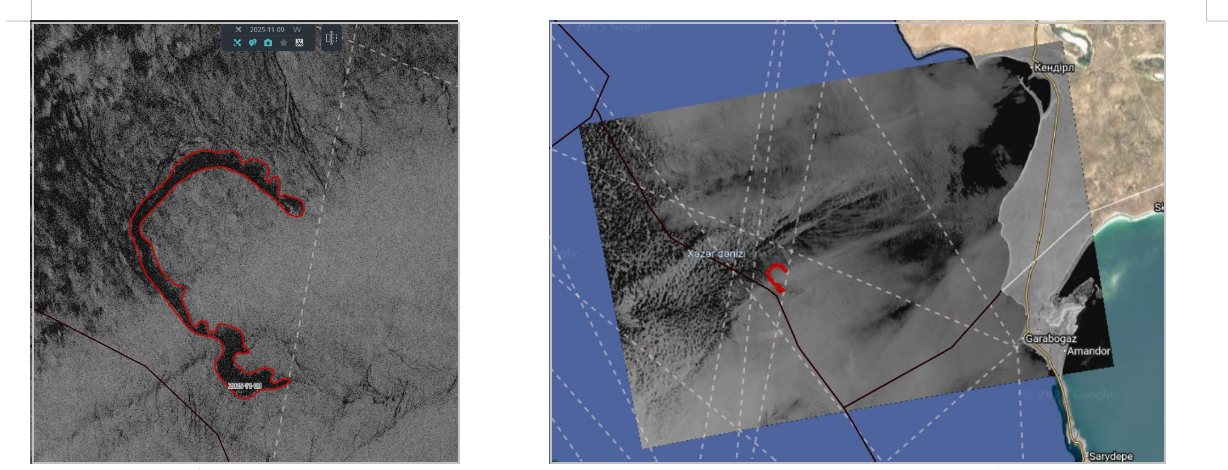 Рис. 1-2. Судовой разлив в казахстанском секторе (0,87 кв. км). 09.11.2025